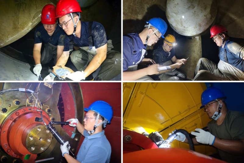 为确保机组始终处于良好备用状态,运行人员对站内电气设备逐台进行绝缘电阻测试、回路通断检查,更换故障仪表、机组碳刷和老化零部件,校准GIS设备温度传感器,形成了一套“测、查、换、校”的“组合拳”,确保电气设备“零故障”运行。运行人员深入3#、4#、5#主机组内部,在阴暗潮湿环境中对机组水下部分进行全方位“体检”,详细测量记录叶片间隙数据,评估叶片、叶轮、流道、冷却装置部件腐蚀程度,对气蚀、锈蚀、阀芯损坏等问题立行立改,通过精准修复、部件更换、除锈防腐等方式方法,对关键部位进行维修养护,全面消除安全隐患,确保机组运行效率与稳定性。