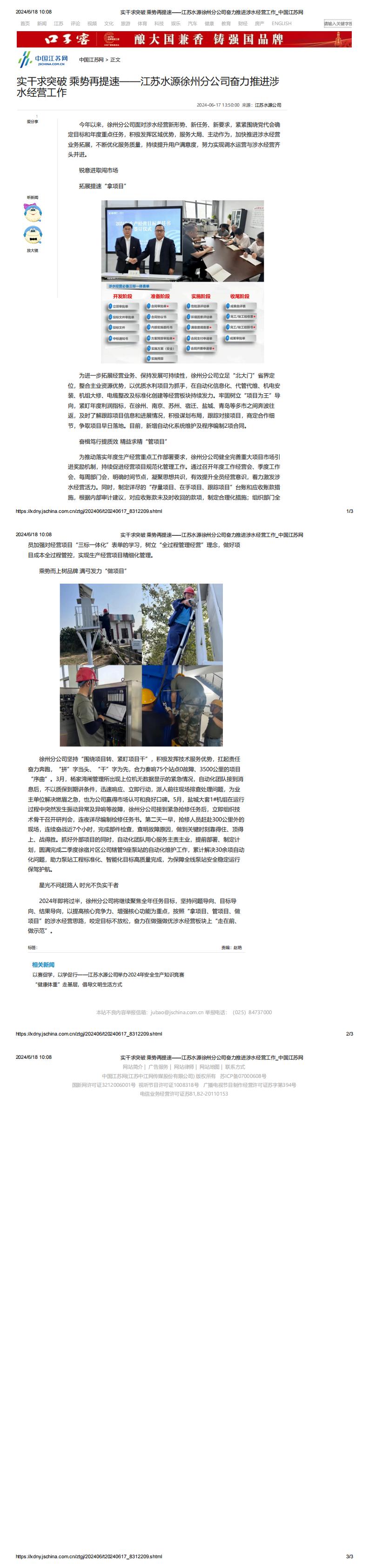 中国江苏网:实干求突破 乘势再提速——江苏水源徐州分公司奋力推进涉水经营工作