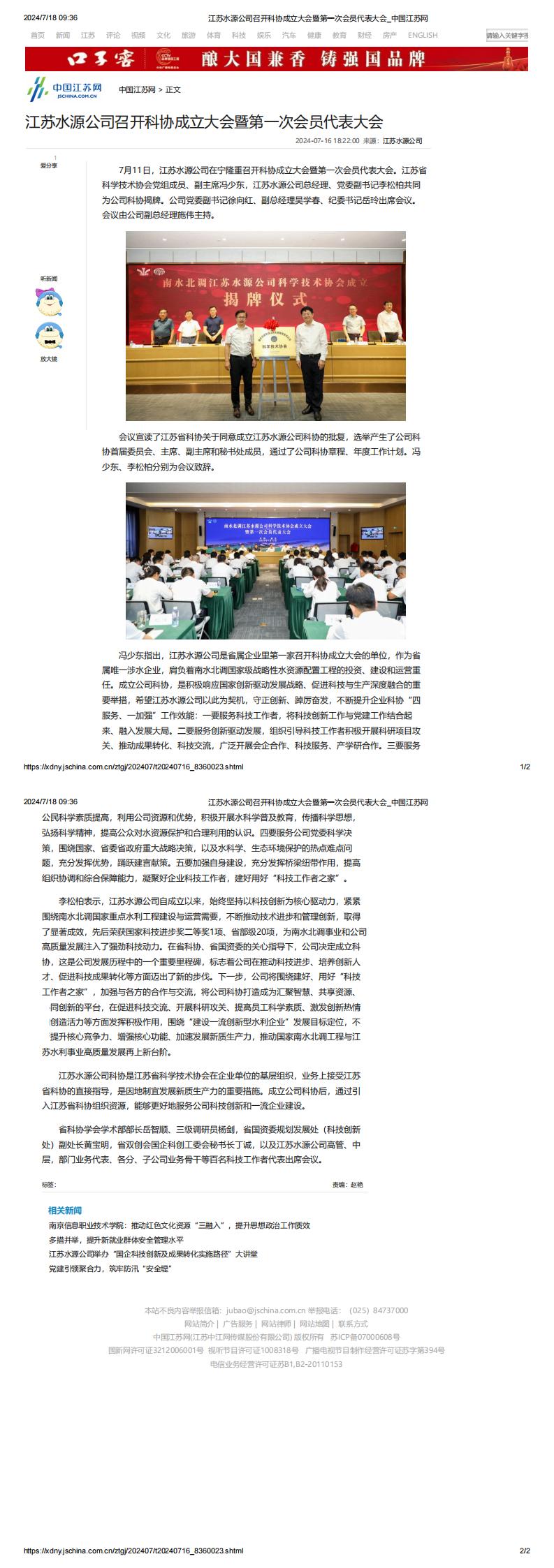 中国江苏网:江苏水源公司召开科协成立大会暨第一次会员代表大会