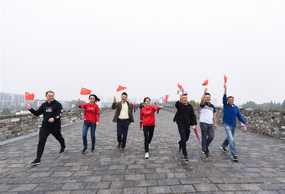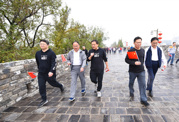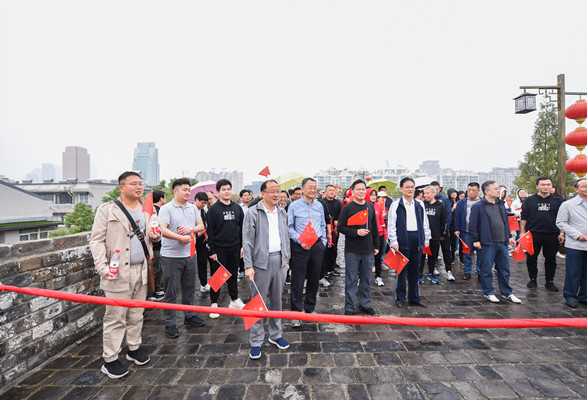 一路上,大家高举江苏开云手机平台和江苏水源公司旗帜,手持五星红旗,沿着古城墙,一边欣赏城墙内外风光,一边交流开云手机平台工程建设和运行管理工作中的心得体会,精神抖擞、斗志昂扬。