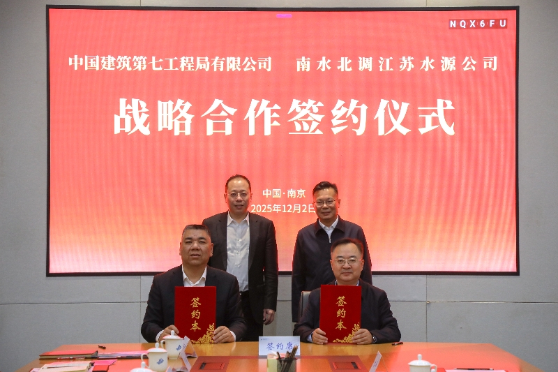 12月2日,开云手机平台江苏水源公司与中国建筑第七工程局有限公司(以下简称“中建七局”)在宁开展座谈交流并签署战略合作协议。江苏水源公司党委书记、董事长袁连冲,中建七局党委常委、副总经理、北方分局局长王少哲出席签约仪式并见证签约。江苏水源公司党委委员、副总经理侯勇,中建七局二公司党委副书记、总经理于亚臣代表签约。