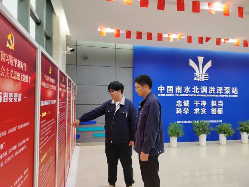 针对本次主题教育,洪泽站党支部认真制定了学习计划。一是迅速完成宣传标语及宣传牌的制作,起到了良好的宣传效果;二是迅速落实专题书籍的采购及发放工作,保障每位党员同志人手一本,支部备足流动书籍供传阅学习,形成了“书在手边,常温常习”的良好氛围;三是与生产实践紧密结合,紧扣年度目标任务,红色引擎领方向,落实调水运行、调水工程标准化创建和“远程集控、少人值守”等各项重点工作,在笃行不怠中,让主题教育学习活动真正入脑入心入行。