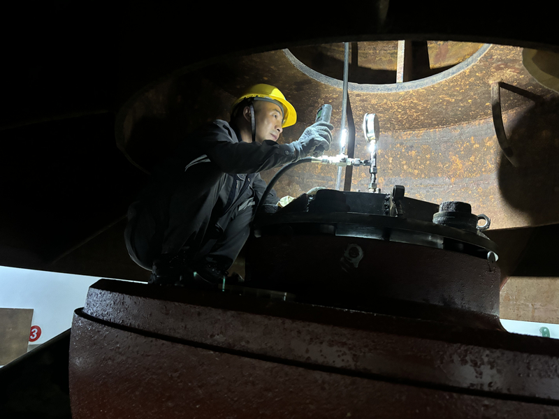 大修过程中,团队坚持“三检”制,严格按照施工图纸和规范要求操作,制定质量检查表、明确质量负责人、严格履行质量验收签字手续等,确保机组螺栓紧固、上下油缸空间清查,液压调节系统压力试验符合规范,将“精益求精”贯穿每一个环节。在受油器内外腔油压试验过程中,发现受油器接力器下腔油压试验不达标,经检查分析,发现是由于接力器上盖本体及连接螺栓孔存在砂眼等铸造缺陷,导致渗油现象。团队紧急联系水泵厂家将上盖紧急运返修复,最终保障了设备稳定运行,充分展现了维检团队的专业实力。