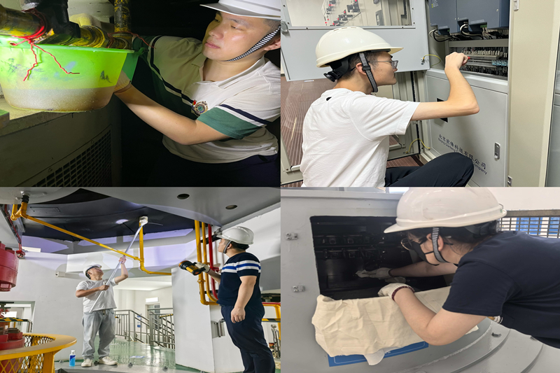 停机指令下达后,宝应站管理所迅速部署、统筹规划,全面推进设备隐患排查、养护及专项维修等工作。重点针对主水泵、高低压电气柜等核心设施开展“地毯式”检查,对排查发现的设备标识模糊、应急通道指示灯故障等问题进行立行立改;针对清污机设备老化磨损造成的运行期故障,扎实开展清污机皮带挡板更换与传动部件润滑油加注等日常保养,并及时制定维修方案上报专项;严格遵循“靶向治理、全面焕新”原则,彻底清除三号机坑油污,对核心设备端子排逐一排查紧固并补全标识,同步完成主机架底板清洗、叶调控制柜除尘、主机碳刷打磨清理等精细化作业,全方位恢复设备最优性能,高效筑牢泵站安全运行“防火墙”。
