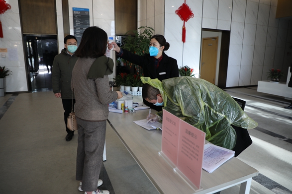 员工依次接受晨检、量体温